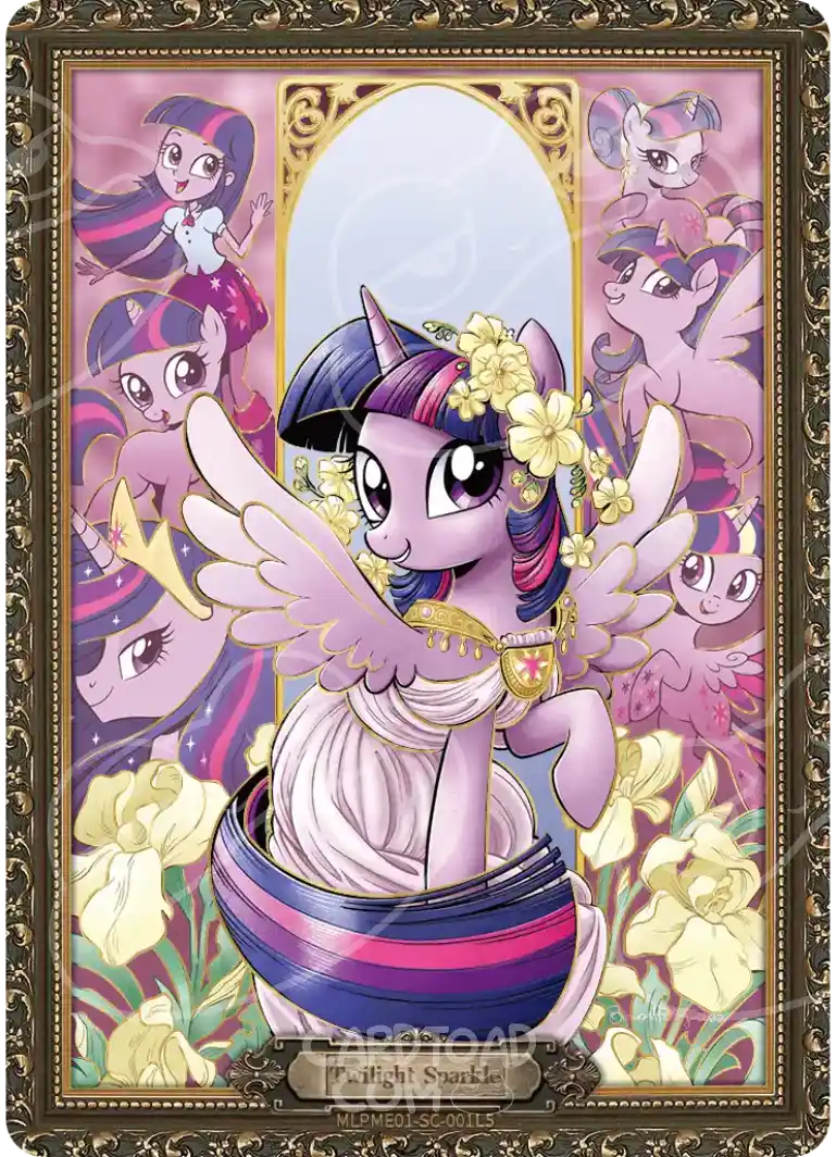 Secret Cards (SC) are the rarest slot in Moon Edition — rarer than SGRs, featuring unique artwork that exists nowhere else in the entire print run. Princess Twilight Sparkle SCSC sits at the very top of the ME01 collector hierarchy. The artwork is completely distinct from her SGR version, and the pull rate makes a box-hit feel genuinely special.