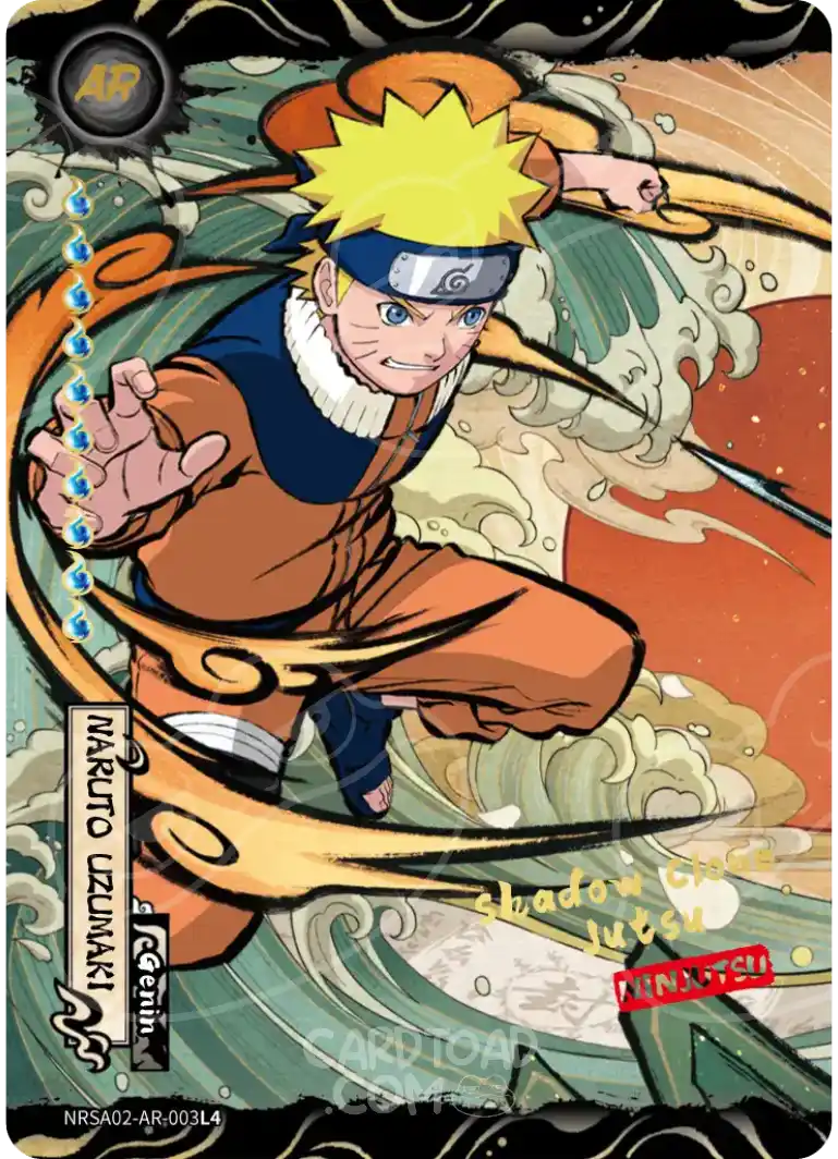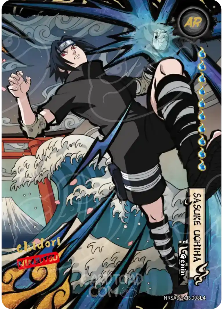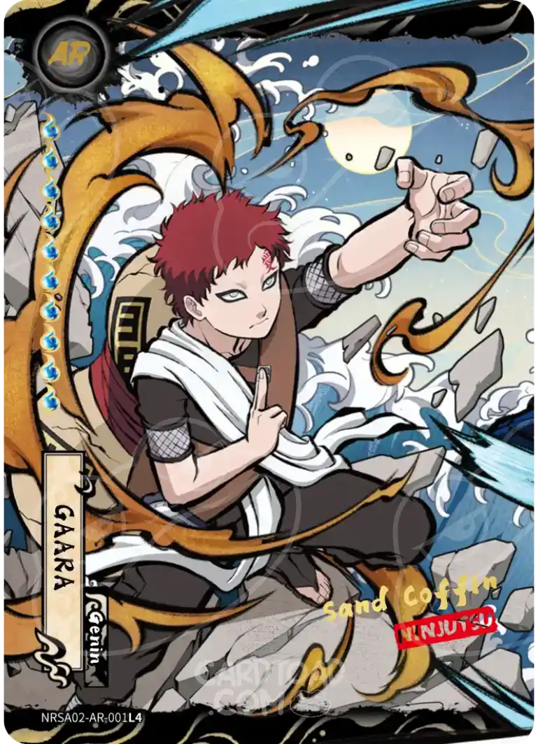 GaaraAR leads the AR lineup with his signature sand armour rendered in a full desert palette that fills every edge of the card. Naruto UzumakiAR captures Nine-Tails chakra mode in a way that practically glows off the surface. And Sasuke UchihaAR rounds out the most-wanted trio — Sharingan activated, artwork that demands a top-loader and a centrepiece spot in any binder.